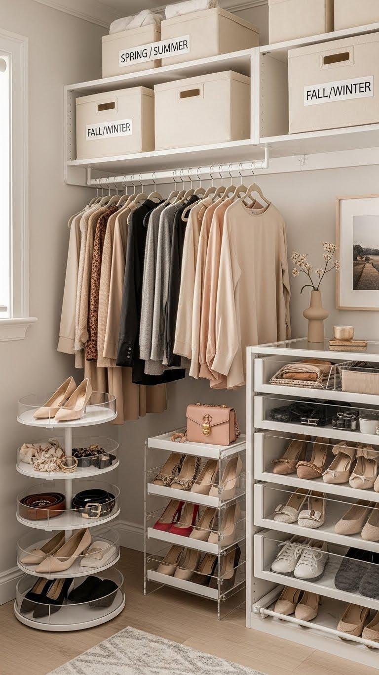 If you’ve pared down décor to a few meaningful pieces, bring that same restraint to your closet so every item earns space and purpose. Edit by function, keep neutrals visible, and store extras for seasonal rotation in labeled bins. Use slim hangers, a shoe carousel for compact display, and clear baskets so you can choose freely, quickly, and with calm intention.