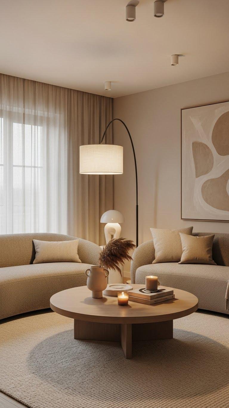 Warm Greige Living Room With Curved Sofas