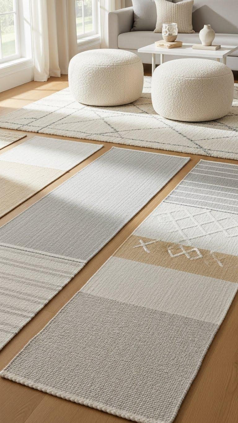 Balancing bouclé upholstery with woven rugs transforms a neutral room from flat to tactile, so you’ll want to think in layers that both comfort and delineate. Pair bouclé ottomans with low-pile rugs, then anchor circulation with woven runners to guide movement. Mix subtle patterns, vary pile heights, and keep a restrained palette so textures sing without overpowering your liberated, serene space.