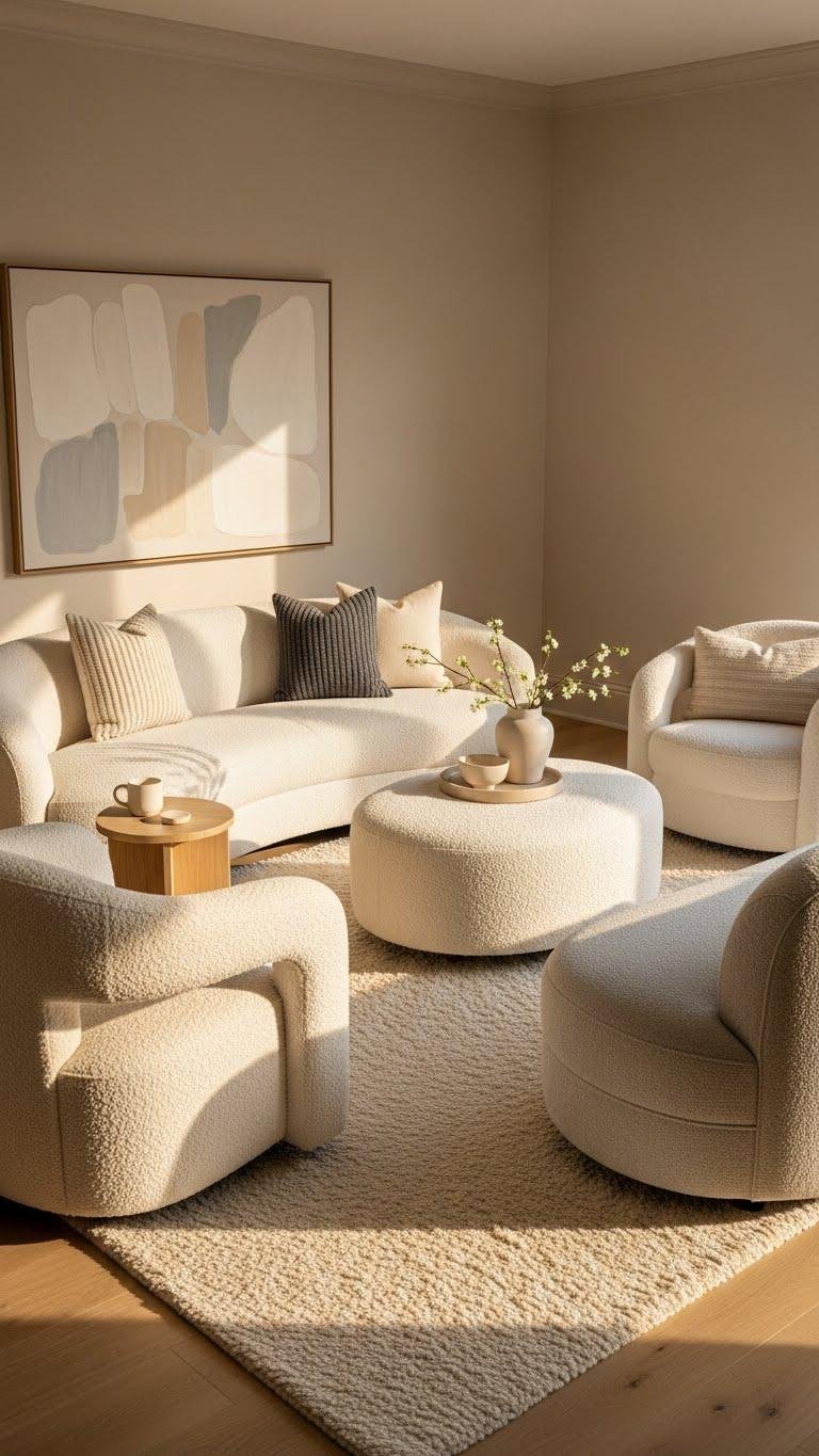 Sink into bouclé chairs and curved seating groupings to soften a neutral scheme with tactile warmth and sculptural poise.