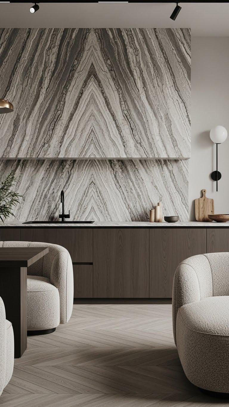 Move from the soft, tactile curves of bouclé seating to a striking yet serene statement wall by specifying a breccia or large natural stone slab backsplash. You’ll choose bookmatched breccia for dramatic symmetry or a quietly refined honed slab for matte depth. Both read as effortless luxury, anchoring neutral palettes while letting you move freely between bold form and calming restraint.