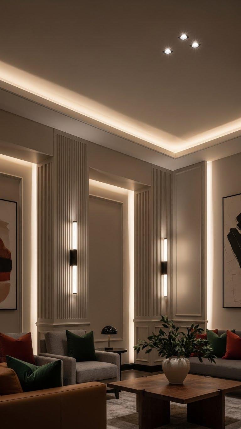 Oxblood and deep green lend warmth and drama to a neutral scheme, but integrated cove and recessed lighting will shape how those accents read throughout the day and night. You’ll use indirect glow for evenings, layering dimmable cove runs with focused recessed fixtures.