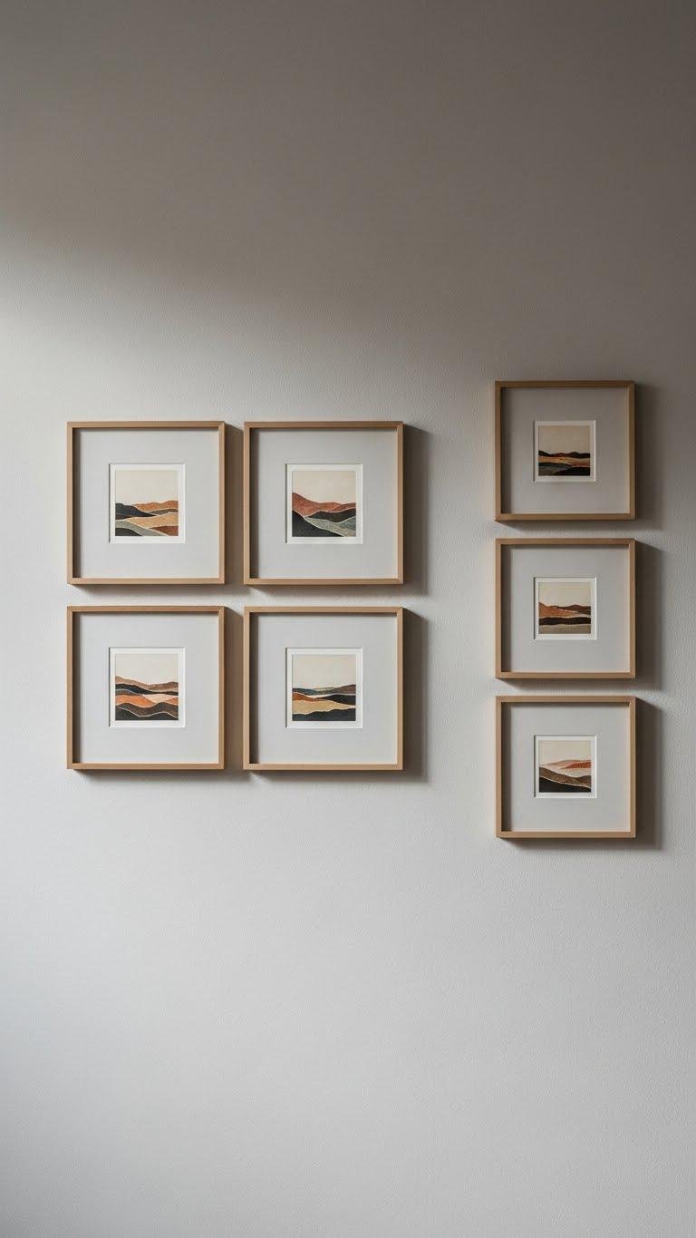 Favor tonal matting to unify varied pieces and maintain restraint. Arrange with a simple grid or offset trio so each work feels intentional, freeing your space while asserting refined, unforced personality.