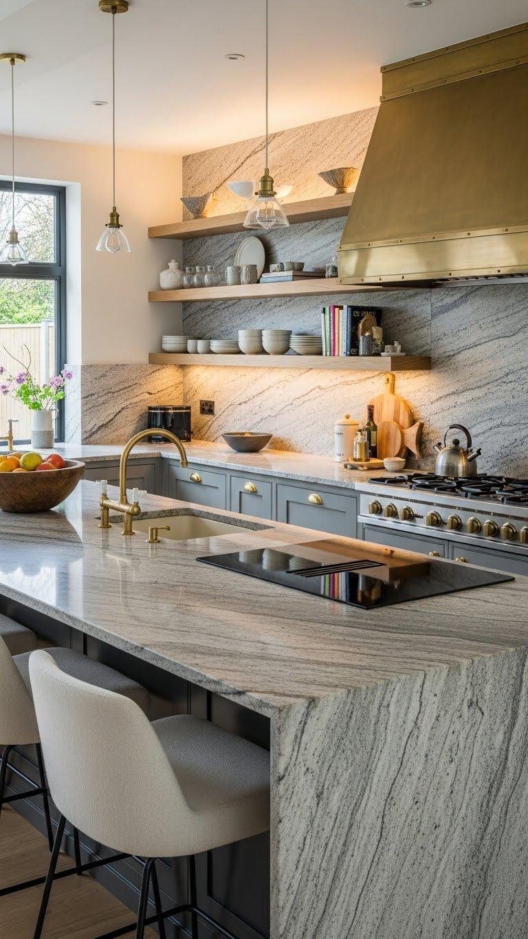 Mix polished and matte stone to give your kitchen a tactile, layered sophistication: glossy countertops reflect light and read as luxurious, while matte backsplashes or island cladding mute glare and ground the room.