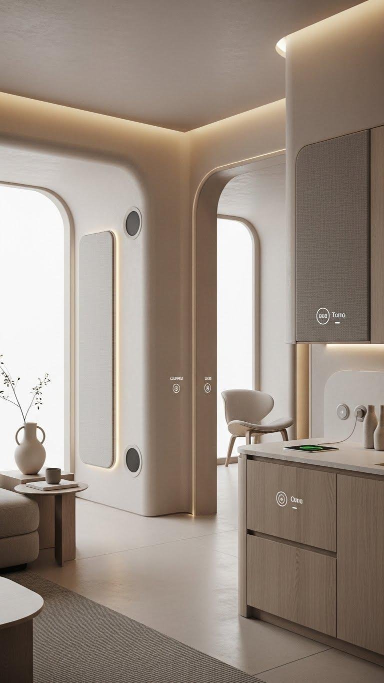 You’ll embrace invisible speakers recessed into walls, cableless charging, and cabinetry with minimal, recessed pulls. Touchless controls keep surfaces pristine and movement effortless.