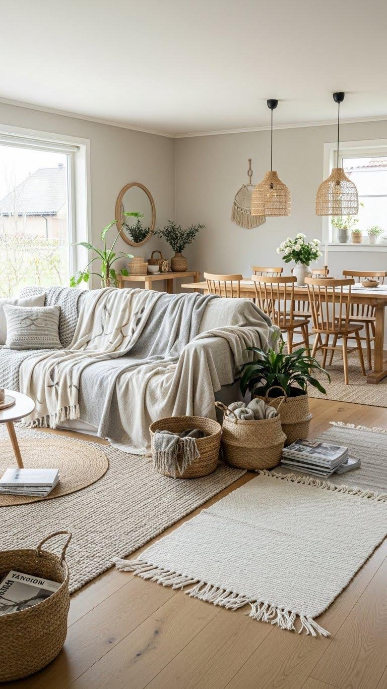 You’ll layer handwoven baskets for storage, drape textured throws, and use seagrass placemats to ground dining settings. These subtle, purposeful accents free your space, marrying restraint with earthy warmth and quiet luxury.