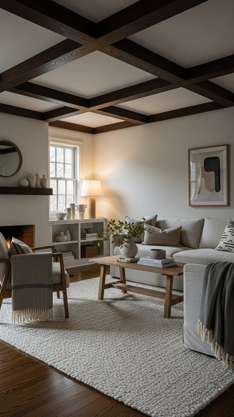 After surrounding yourself with greenery, shift the mood inward to a den anchored by exposed wood beams and warm, tactile finishes. You’ll embrace exposed rafters, low lighting, and a neutral palette that frees thought.
