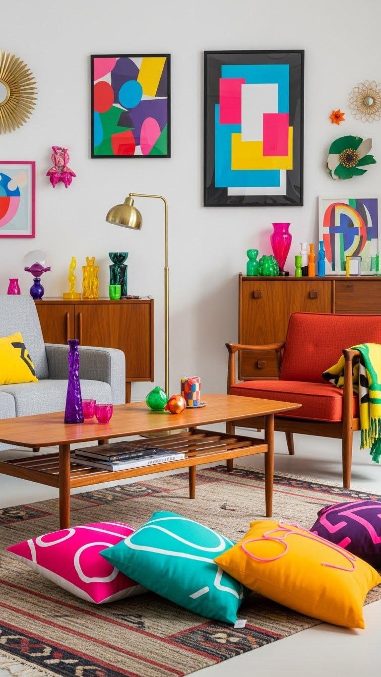 You’ll mix retro silhouettes with playful geometry, balancing teak and brass with neon accents, letting artful contrasts breathe.