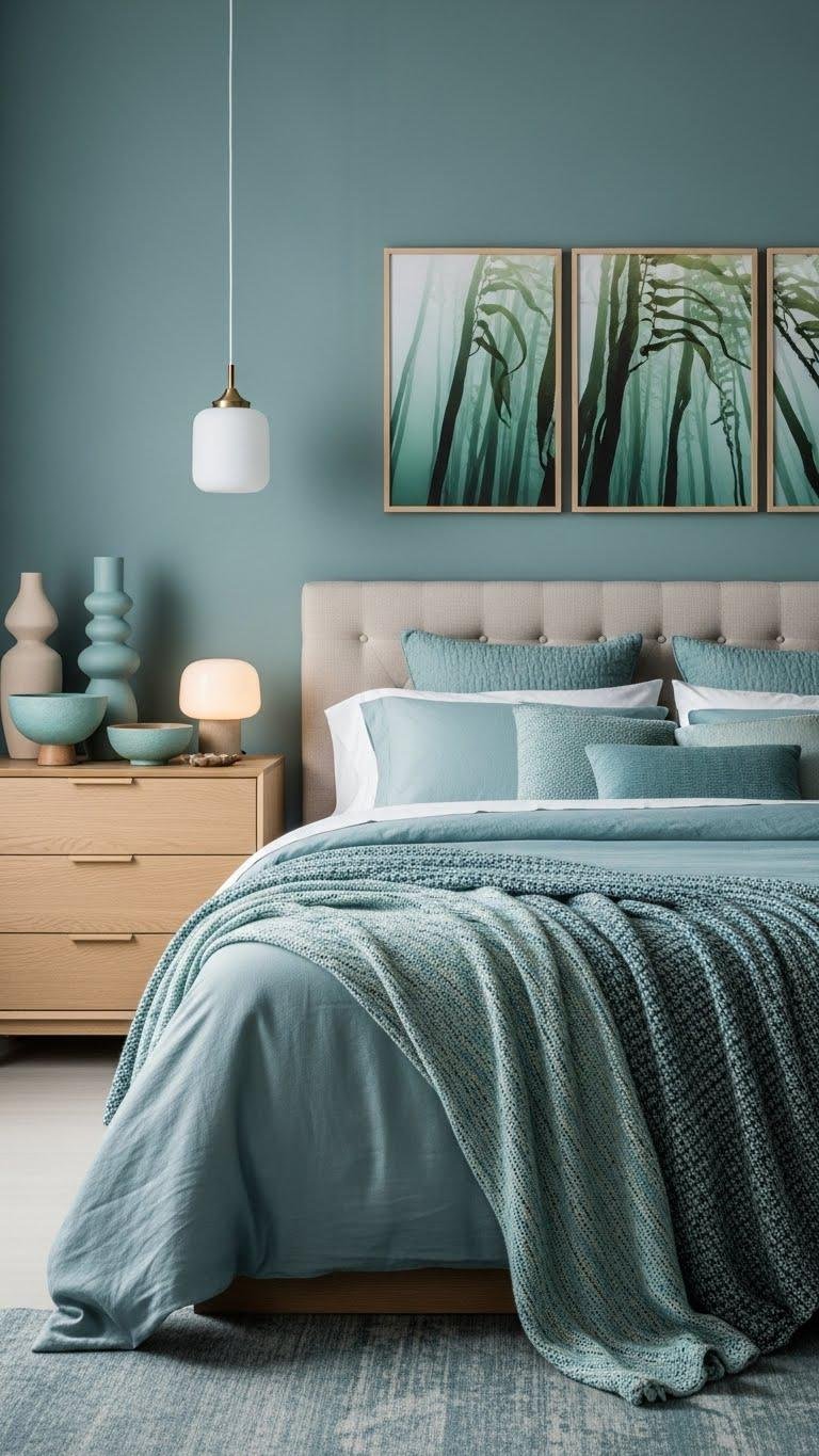 You’ll layer seafoam textiles, matte teal walls, and light wood to keep things airy.