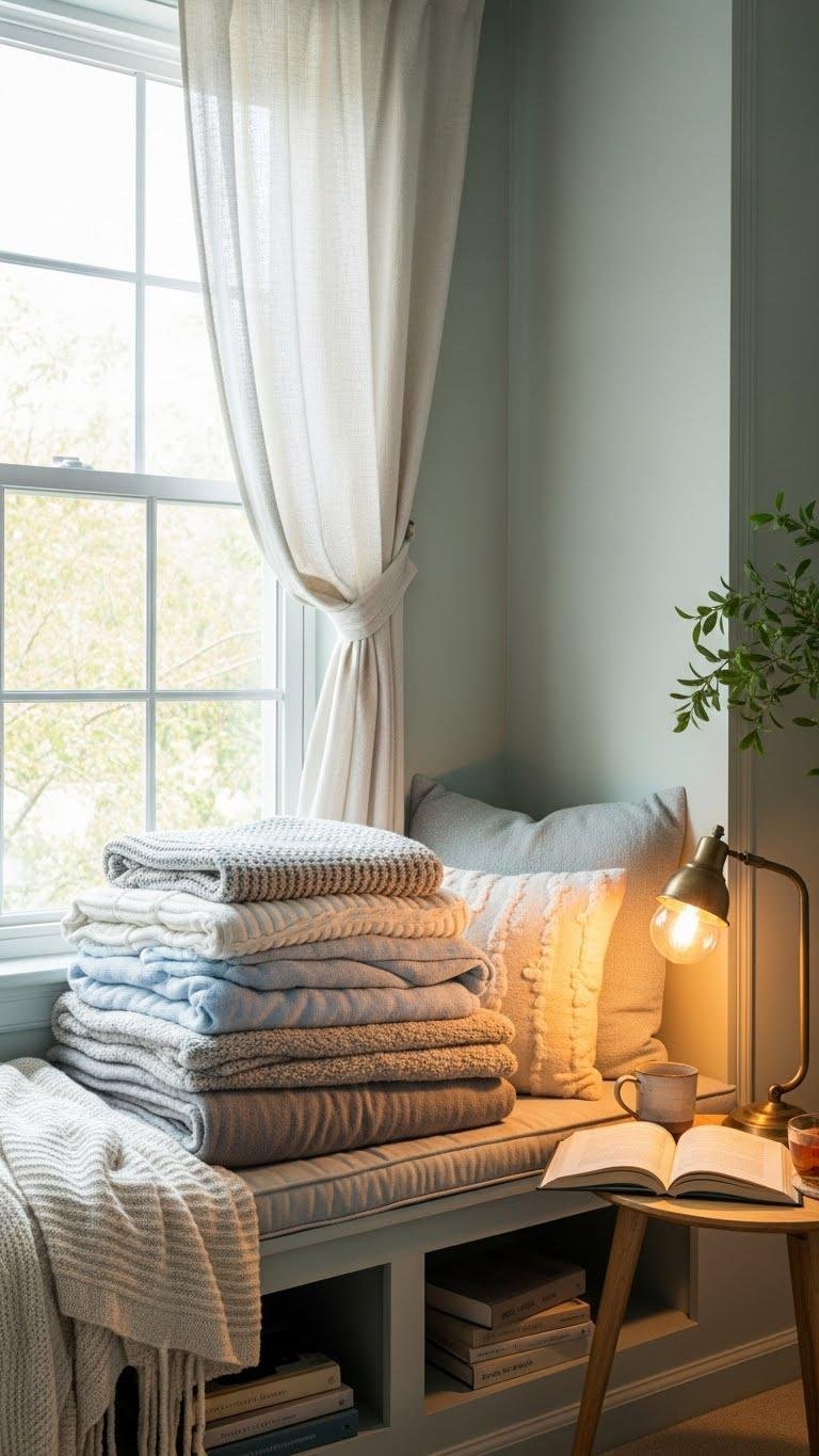 After you’ve cleared visual clutter with clever storage, layer in nubby textiles to bring warmth and tactile interest to the sunroom. You’ll mix nubby throws, woven rugs, and low-profile seating for an inviting, lived-in look.