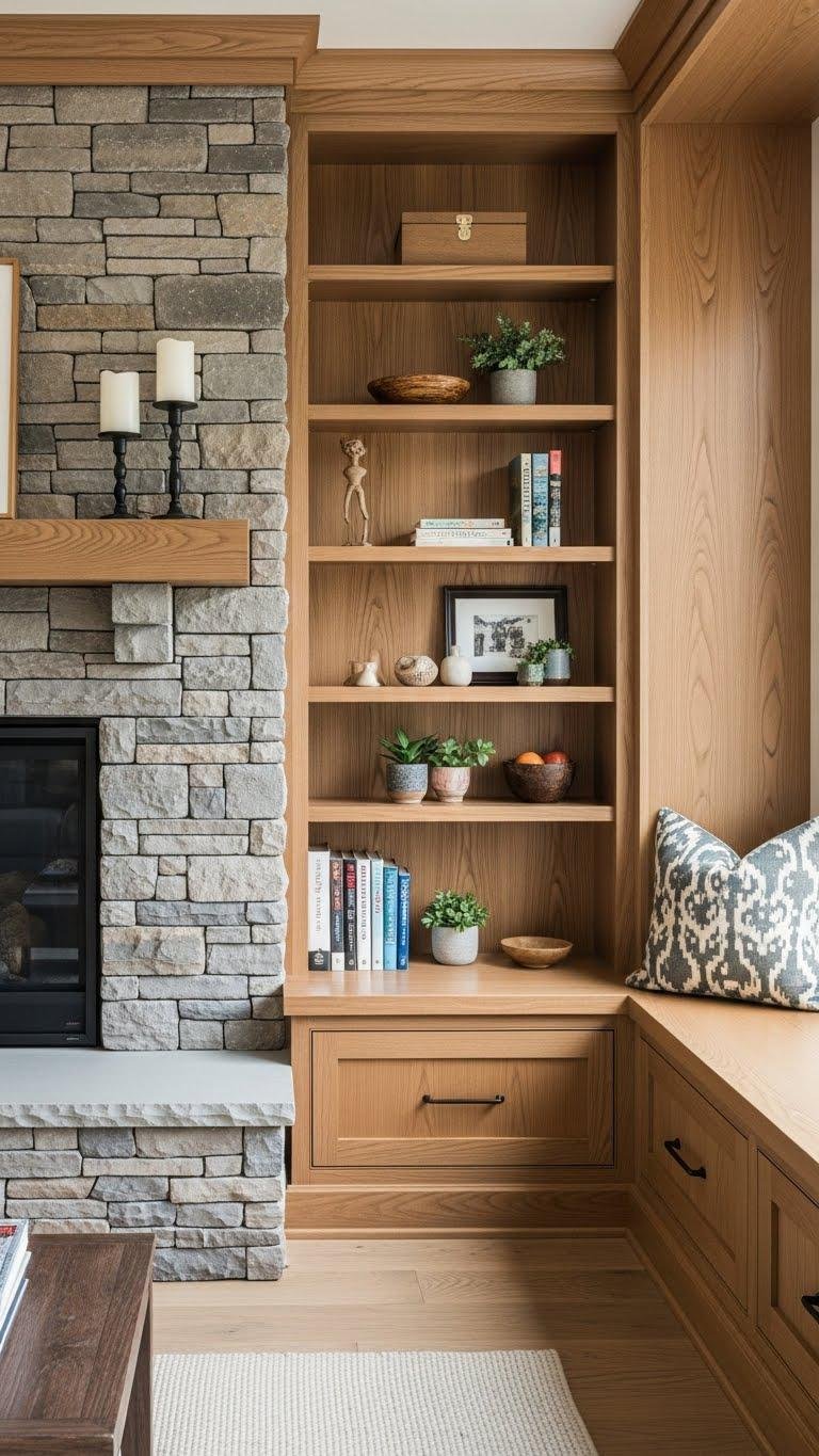While the stone hearth sets a warm, tactile anchor, handcrafted wood joinery and built‑ins shape how you live around it, adding function and artisanal detail without clutter.