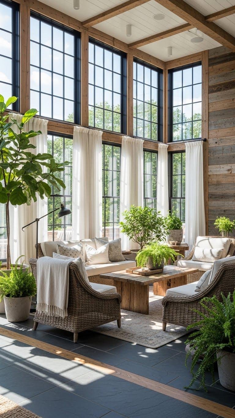 With sunlit beams spilling through oversized windows, you’ll craft a rustic modern sunroom that feels both grounded and open.