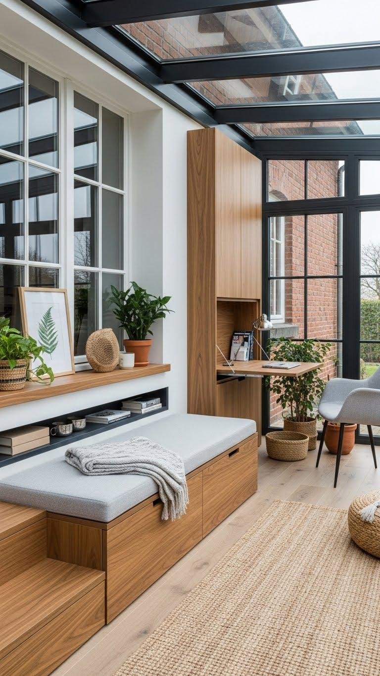 Reveal overlooked corners to keep your rustic modern sunroom feeling airy and intentional. You’ll use under stair cabinetry and built in seating to conceal clutter while preserving flow.