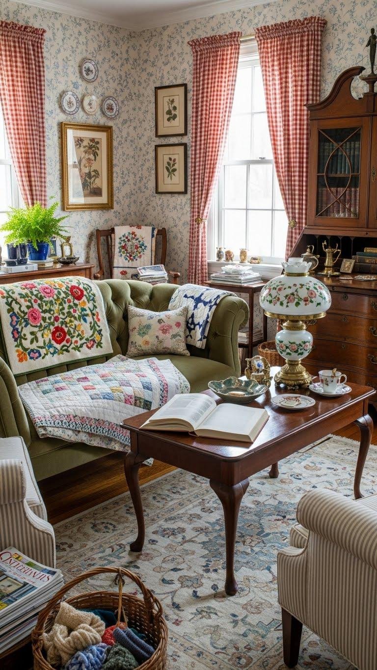 With a nod to heirloom charm and a wink at modern sensibility, your parlor mixes chintz florals, tailored upholstery, and polished antiques so the room feels both curated and comfortably lived-in. You’ll layer heirloom textiles over a tufted settee, pair porcelain lamps with brass accents, and hang gingham curtains for fresh contrast. It’s polished, personal, and unapologetically cheerful.
