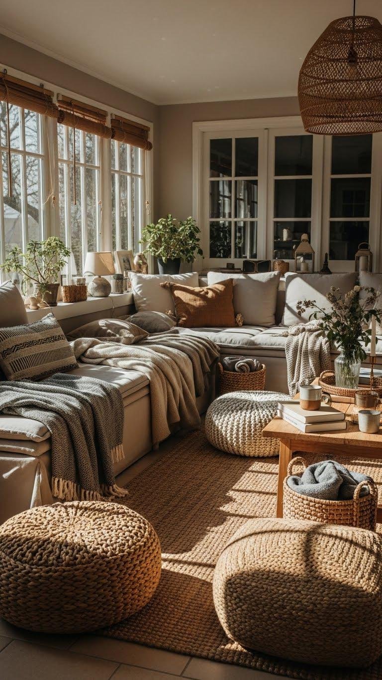 Add tactile ottomans as movable surfaces for lounging or impromptu gatherings. Keep colors muted, patterns minimal, and textures bold to maintain freedom and effortless style.