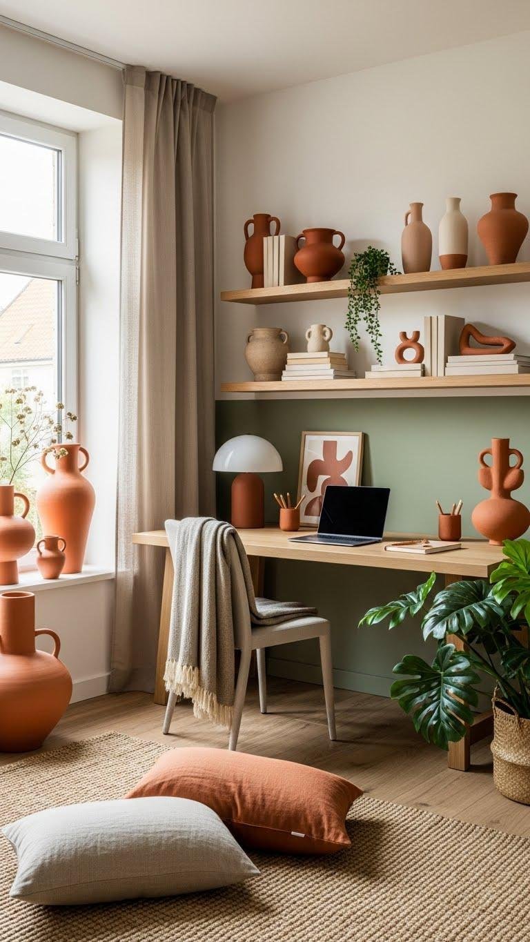 Comfort anchors a warm earthy home office, where clay, terracotta, and muted greens work together to calm your focus and sharpen your creativity.