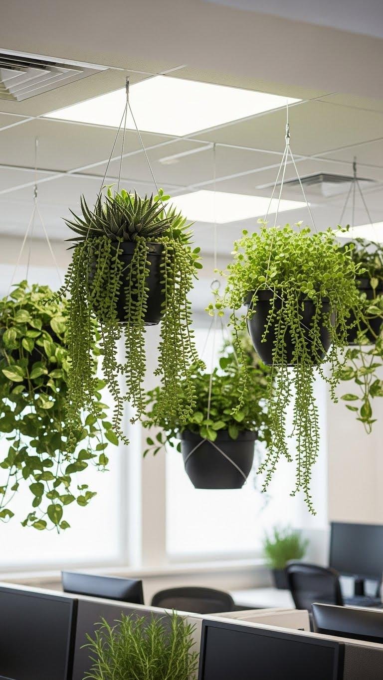 Suspend a living canopy above your workspace to free up surfaces and add instant texture and life. You’ll love ceiling-mounted planters that let light flow and air move while you work. Choose a hanging herbarium for scent and utility, or mix canopy succulents for low-maintenance green drama. Hang at varying heights to create effortless depth and a liberated, airy vibe.