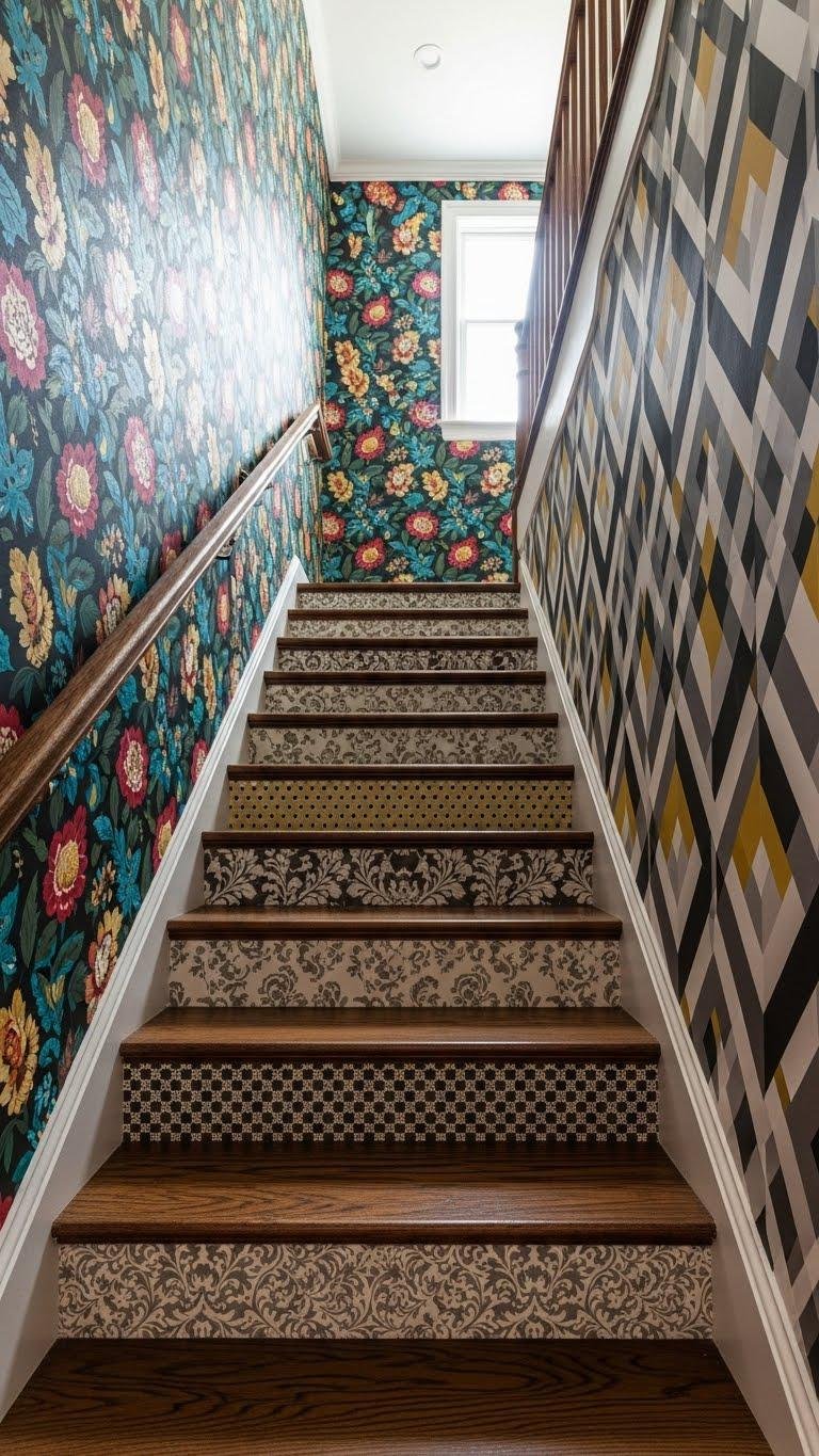 If you want to turn a plain stairwell into a showstopper, richly patterned wallpaper does the heavy lifting — drawing the eye upward and giving each step its own moment.
