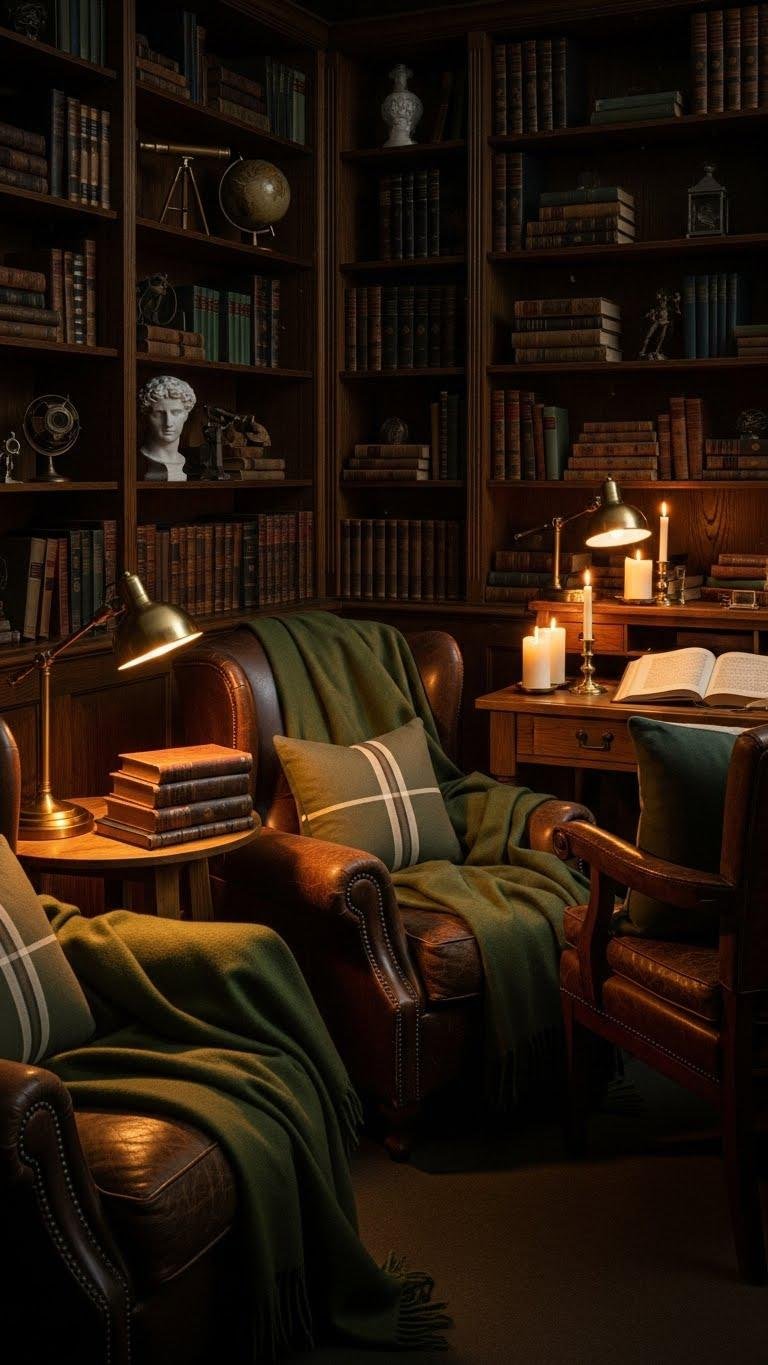 Where the parlor celebrated sunlit florals and heirloom cheer, the library nook leans into shadow and study—you’ll trade gingham for charcoal, porcelain for leather, and layered textiles for wool throws that invite long reading sessions.