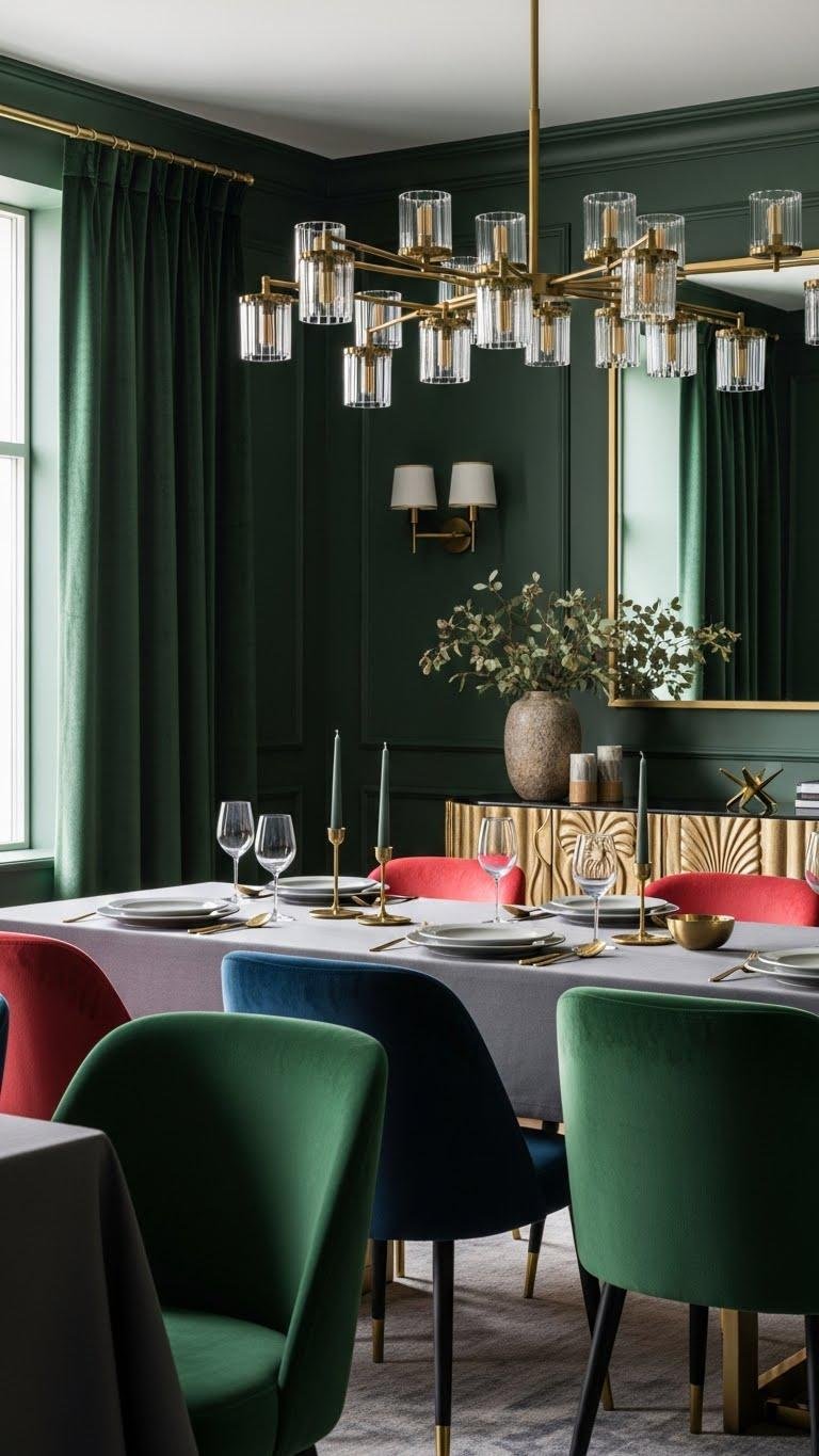 Color can be your boldest design decision: paint the walls a deep emerald or sapphire, then layer in velvet chairs, brass accents, and a statement chandelier to create a dining room that feels both luxe and inviting.