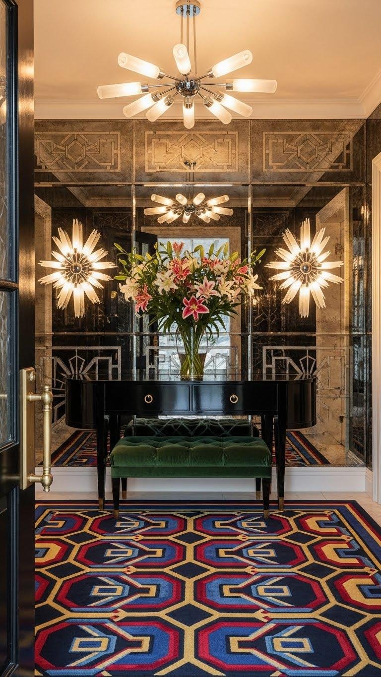 After bathing your dining room in jewel tones and plush textures, carry that same luxe energy straight to the entryway with Art Deco-inspired glam.