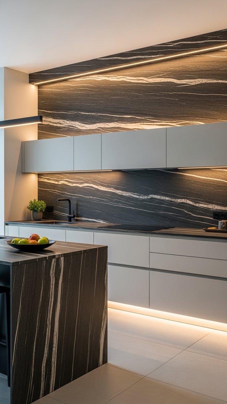 Think of a single, soaring stone slab as the room’s focal point — a full-height backsplash that stretches from counter to ceiling and gives your kitchen an instant architectural heartbeat.