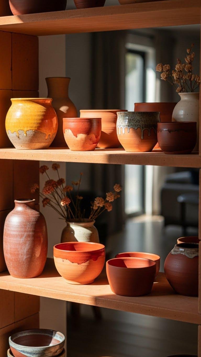 A terracotta and clay corner brings grounded warmth to your home, where sunbaked oranges and earthen reds anchor a small, intentional vignette.