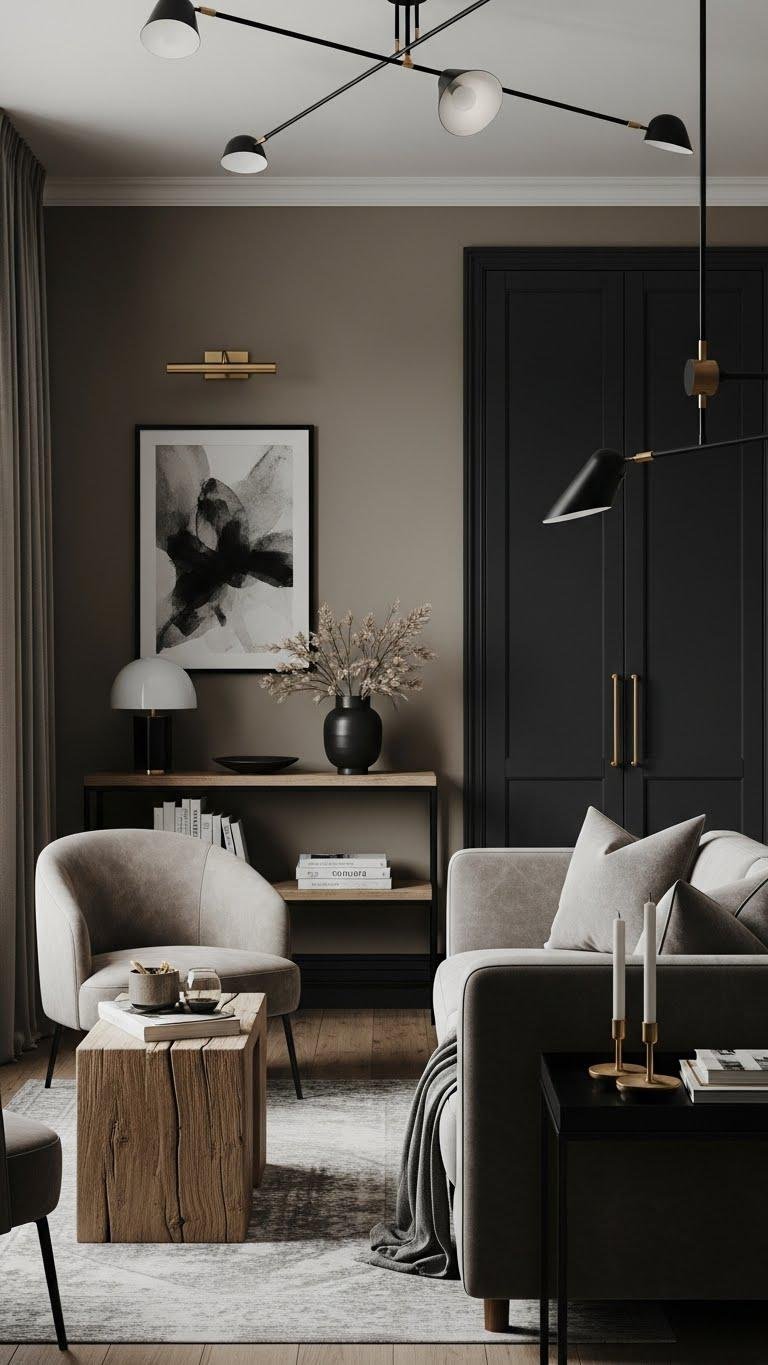 A moody taupe and charcoal suite wraps the room in deliberate contrast, where warm, grounded taupe walls meet inky charcoal accents to create a grown-up, restful refuge you’ll want to retreat to.