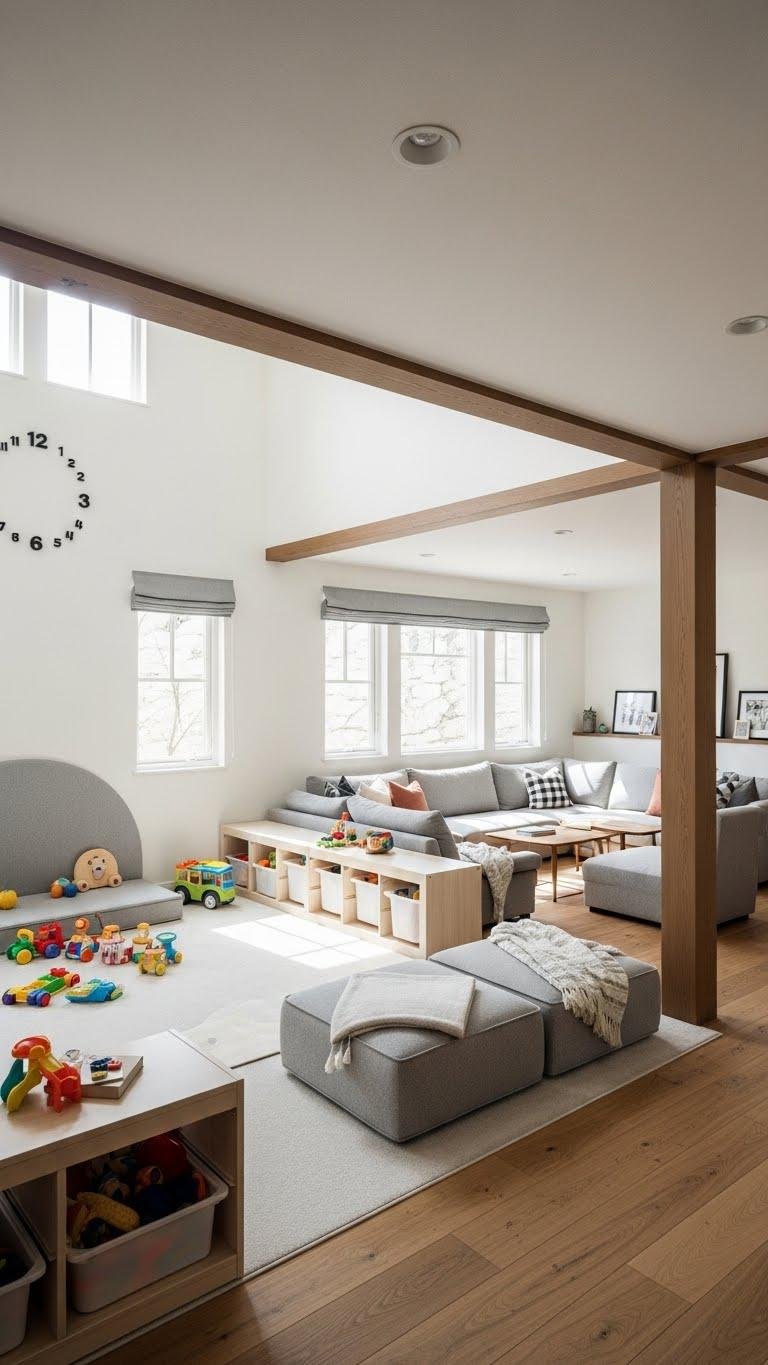 When you plan a family-friendly flexible layout, think in zones that adapt as needs change: a soft play area that tucks away, a conversation cluster that expands, and clear pathways that keep flow and sightlines open. You’ll create multi generational flow with modular seating, movable rugs, and low shelving. Prioritize toy friendly storage, durable finishes, and open sightlines so everyone feels free and connected.