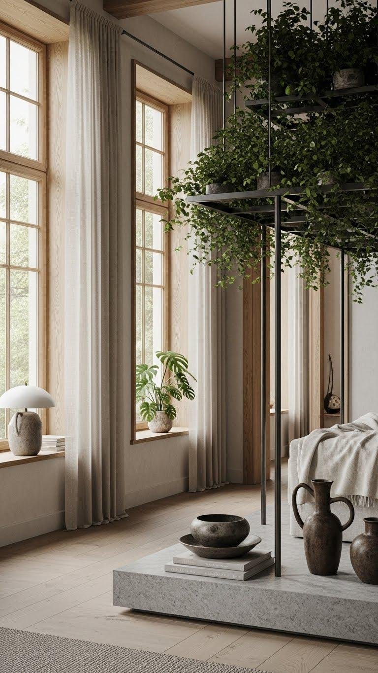 You’ll arrange layered foliage beneath a potted canopy, juxtapose stone textures with matte metals, and choose authentic artisan pieces that honor craft. The room breathes — minimalist, free, quietly alive.
