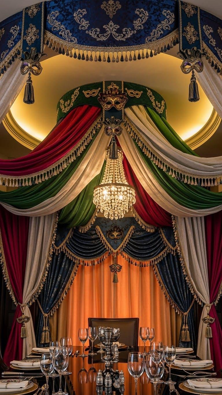 Draping your dining room ceiling in masquerade fabrics turns a meal into theater, letting you shape mood with texture, light, and surprise.