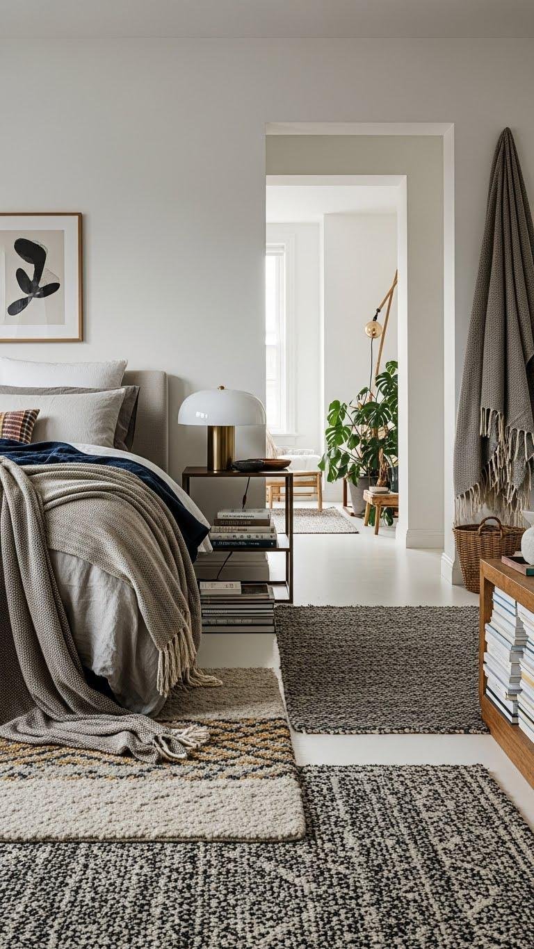 A cozy bedroom retreat starts with thoughtful layering—soft linens, a mix of tactile throws, and rugs that invite bare feet—so you can create depth and warmth without clutter.