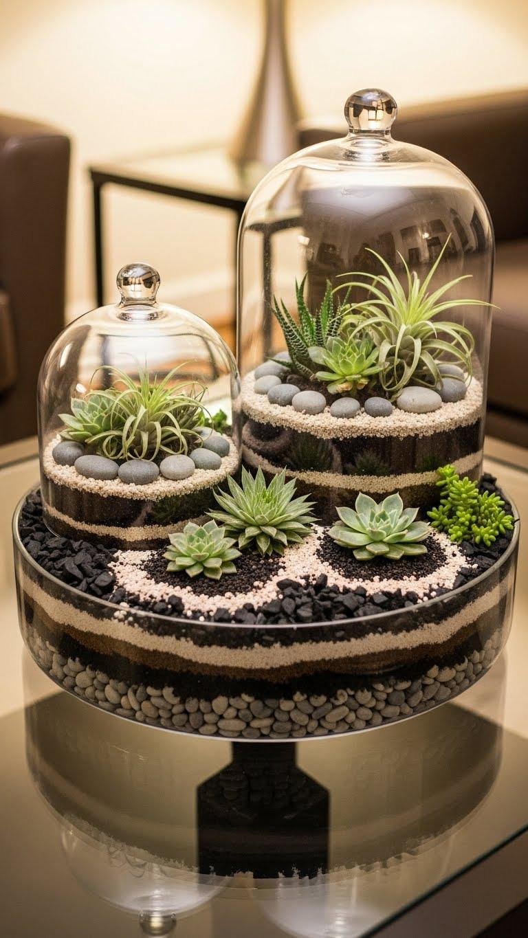 Set a low, glass-topped coffee table as the stage for a living centerpiece that mixes geology and green—layered pebbles, charcoal, and sandy soil anchor an array of compact succulents and air plants so each specimen reads like a miniature landscape. You’ll craft a mini greenhouse feel with glass cloches, tidy pebble arrangement patterns, and negative space that lets guests roam the scene with the eyes.