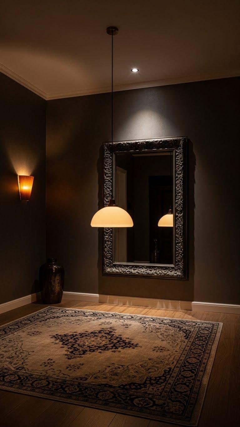 Step into a theatrical moody entryway and let the lighting do the first wave of storytelling — a low-hung pendant, a sconce with a warm amber glow, or a recessed spotlight can sculpt shadow and draw the eye to a single statement piece. You’ll craft a dramatic entry that feels like a shadowed vignette, layered textures and a bold mirror inviting guests to pause and breathe.