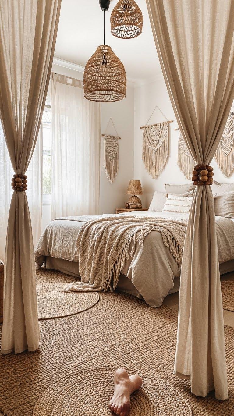 You’ll mix woven textures, earthy beads on curtain ties, and ambient macramé wall hangings to create rhythm and light filtering. Choose driftwood tones, linen bedding, and barefoot-friendly rugs so your space feels liberated, intimate, and effortlessly curated.