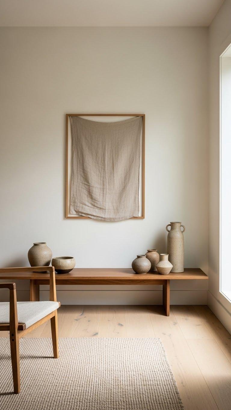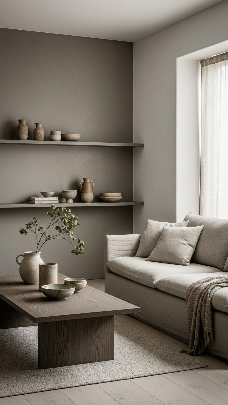 Start with a restrained base: think warm greys, soft beiges, and faded greens that let texture and form do the talking. You’ll build calm with soft taupes and muted olives, pairing matte wood, tactile linens, and simple ceramics.