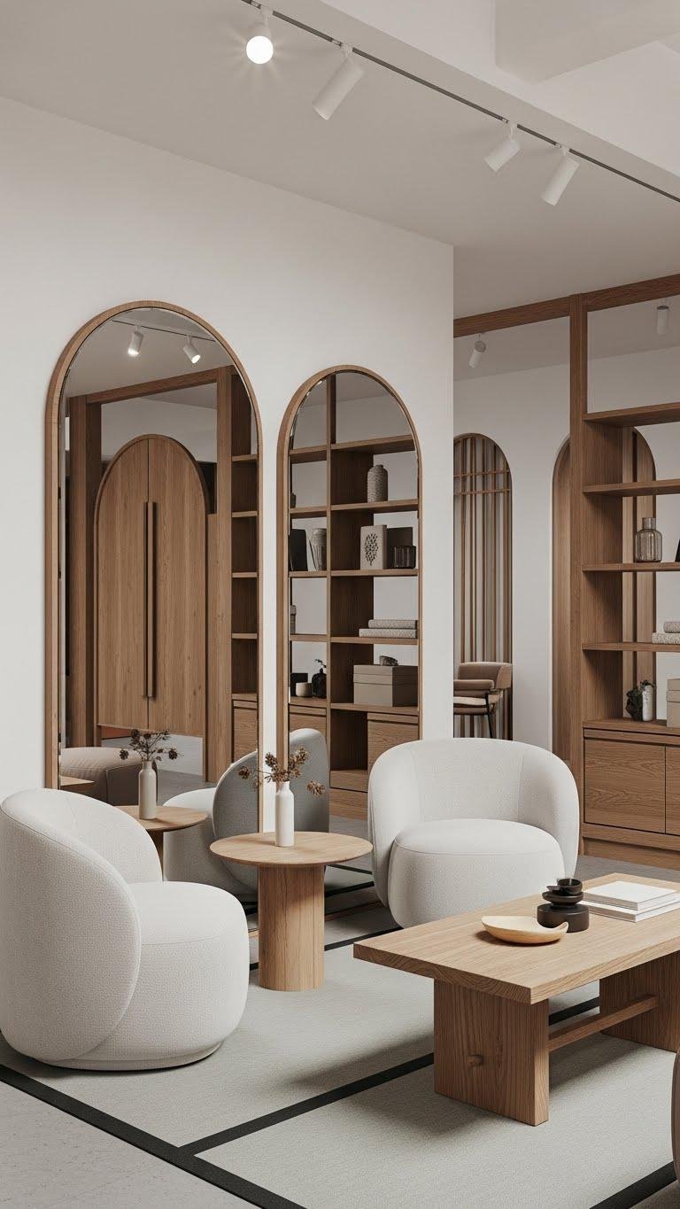 You’ll pair curved minimalism—rounded chairs, arched mirrors—with restrained Japanese rectilinear forms to guide sightlines. Embrace timber geometry in low tables and shelving, letting open space breathe. The result feels deliberate, freeing, and quietly modern.