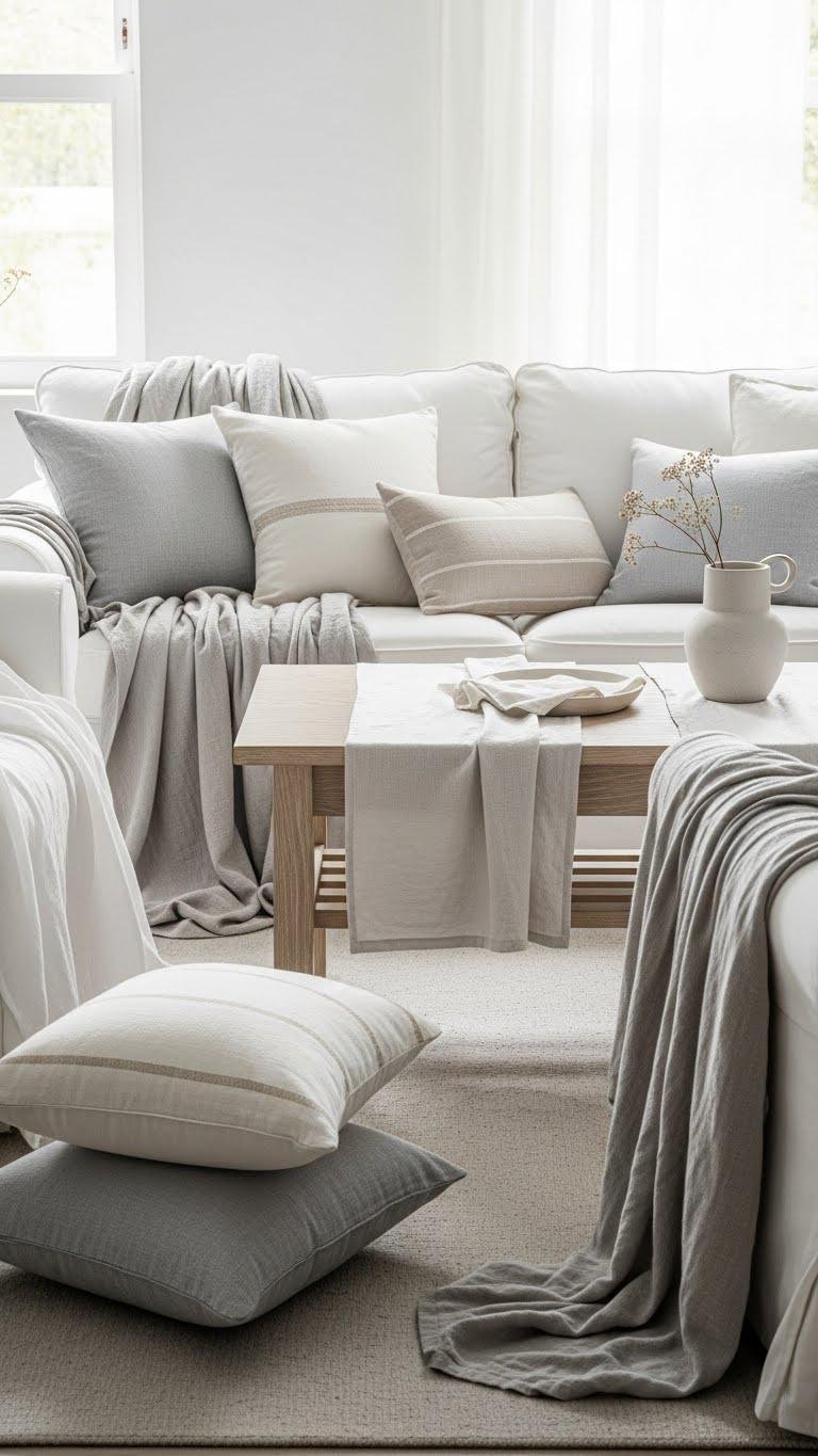 After you’ve balanced curves and lines, bring warmth through textile choices that feel as calm as the room looks. Choose linen and cotton with a soft drape and breathable weave to layer neutral throws, relaxed pillow covers, and simple table linens.