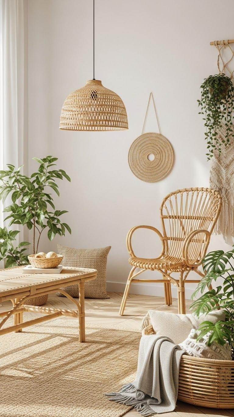 Bring in rattan and wicker to warm Japandi spaces with organic texture and understated craftsmanship. You’ll mix sunlit rattan pieces like a low bench and sculptural chair, add a woven lampshade for soft glow, and place coastal wicker accents to keep things airy.