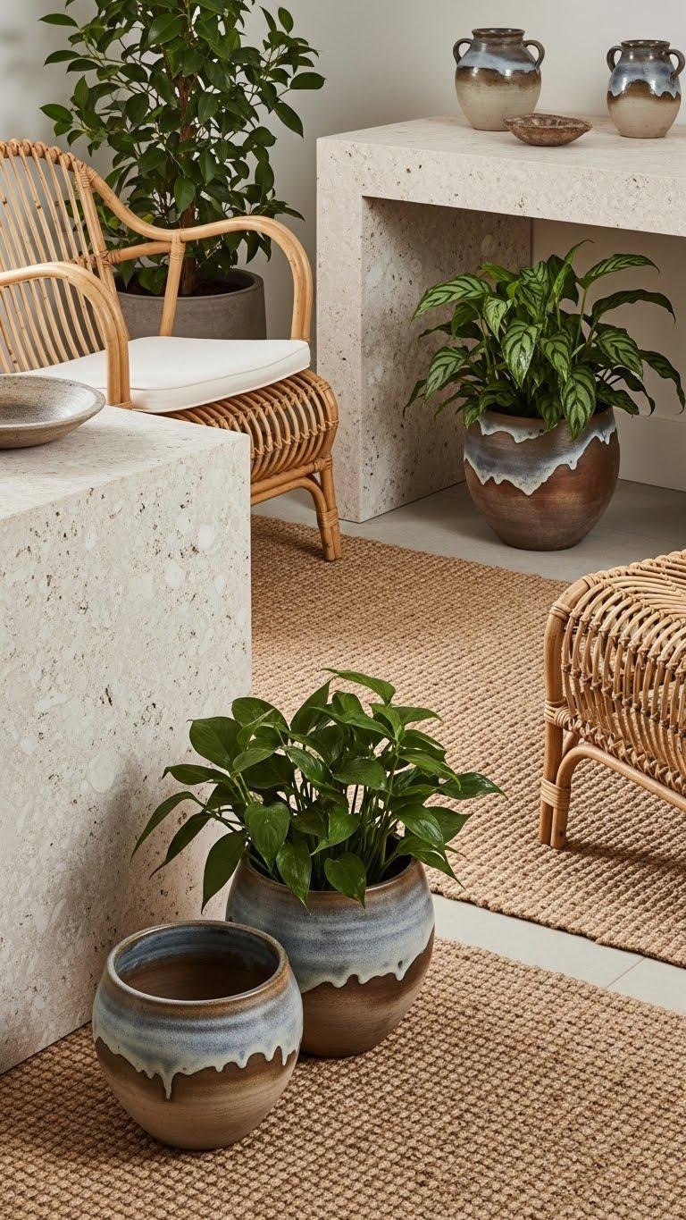 Pair those woven textures with cool, grounded surfaces to keep the room balanced: stone and clay add weight and tactile contrast to rattan’s warmth. You’ll layer stone countertops, clay planters and matte pottery with kiln fired finishes for understated character. Choose irregular edges, muted tones and simple shapes so tactile surfaces feel intentional, calm and free, inviting touch without clutter.