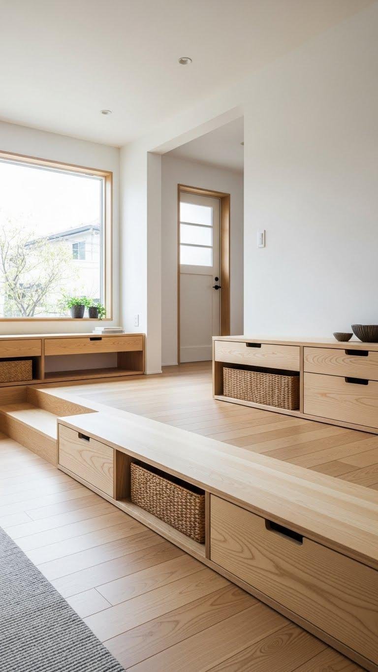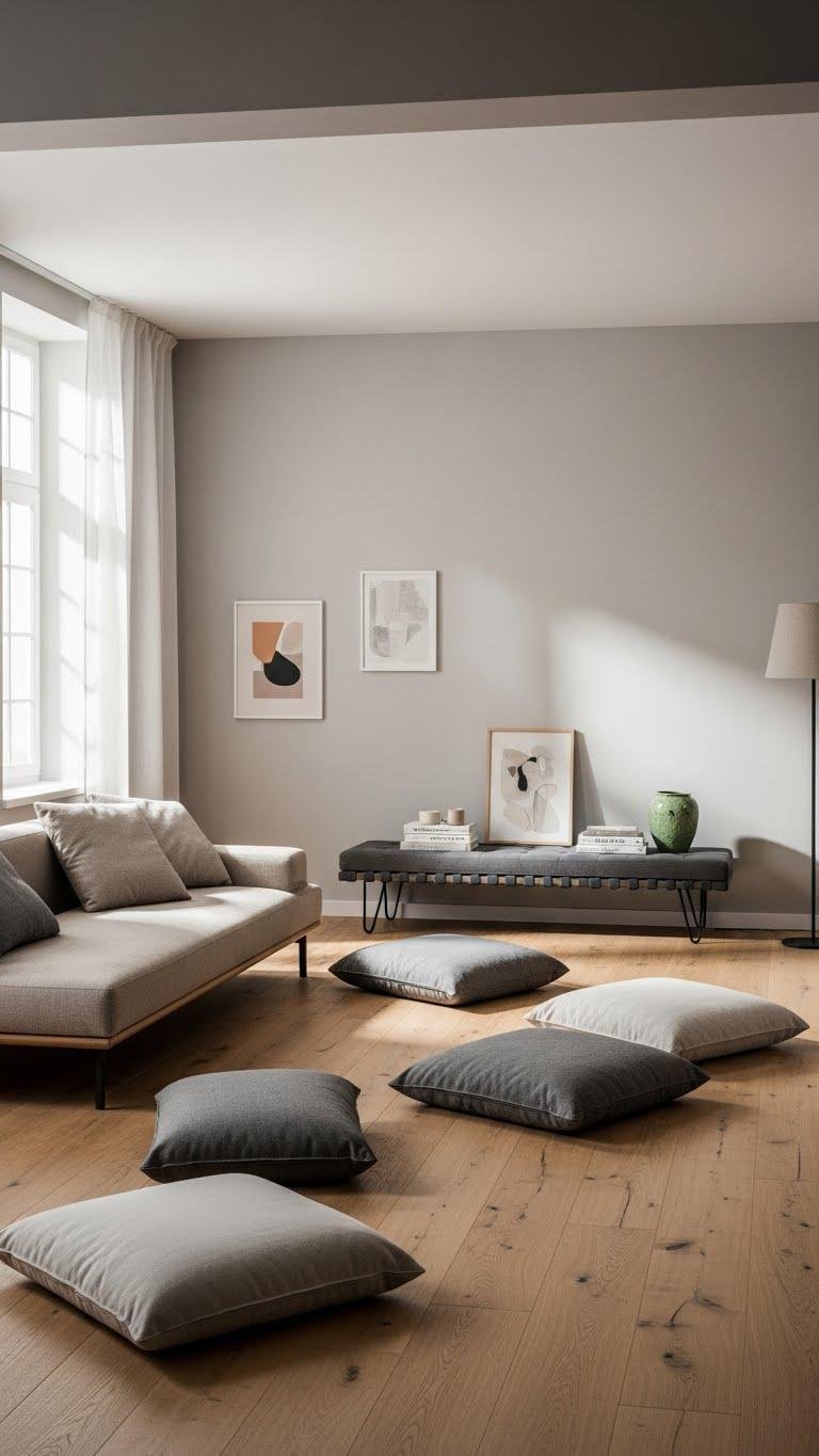 Bring seating closer to the floor to reinforce Japandi’s calm, grounded feel—think low sofas, floor cushions, and platform benches that keep sightlines open and proportions airy. You’ll choose pieces that feel liberating and uncluttered: minimalist frames, muted textiles, and flexible floor cushions for lounging.