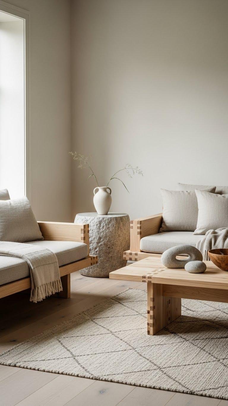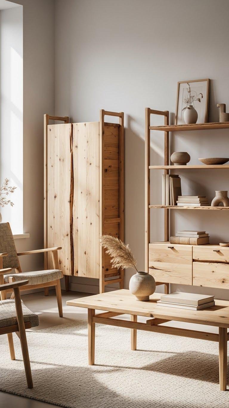 Anchor the Japandi aesthetic with unpainted wood furniture that shows grain, warmth, and honest craftsmanship. You’ll choose pieces in raw timber tones, slender silhouettes, and pared-back profiles that free your space.