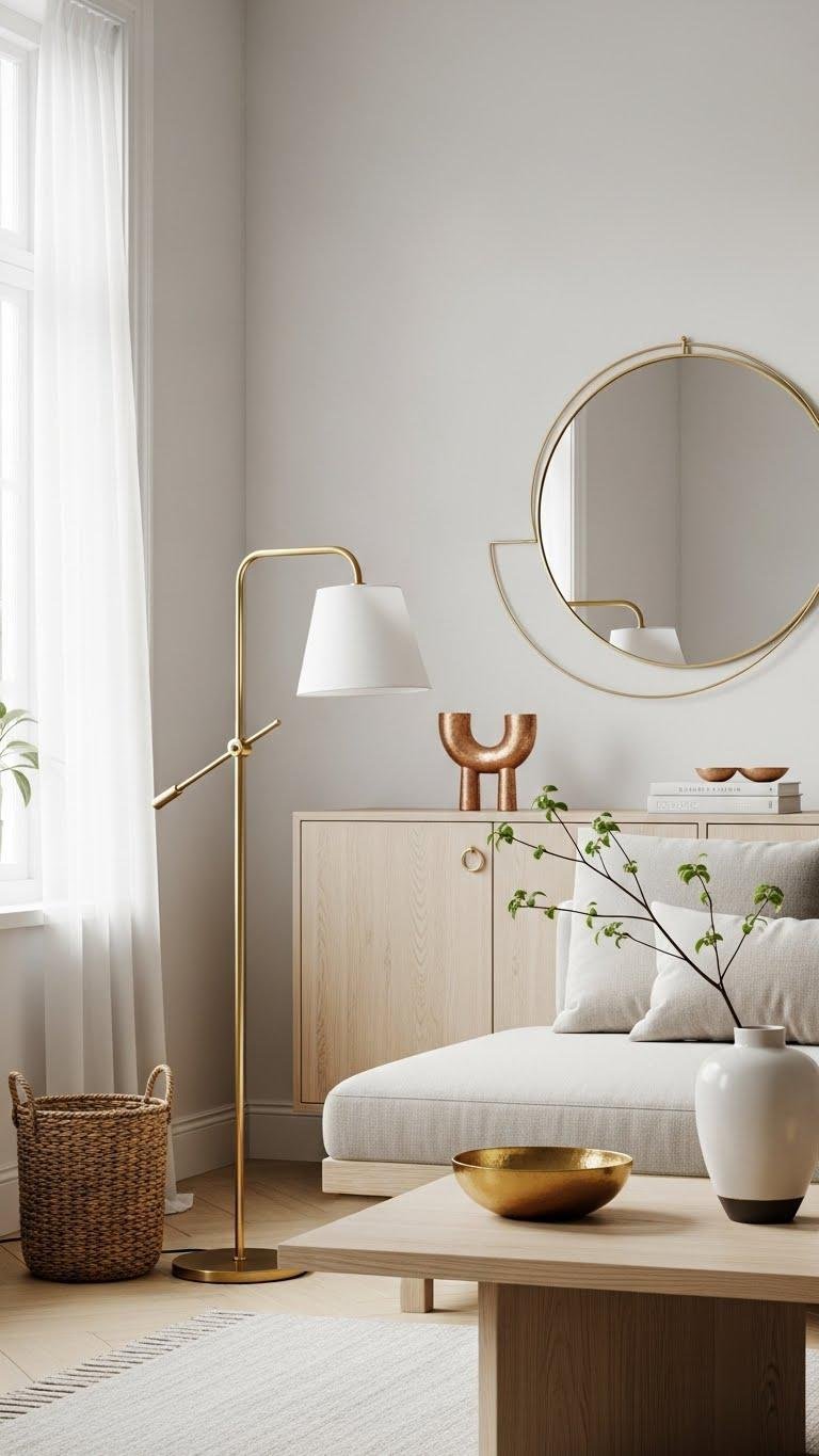Often, you’ll rely on warm metals like brass or soft gold as punctuation marks rather than statements — a slim lamp base, a single cabinet pull, or a delicate mirror frame adds glow without overpowering Japandi’s calm minimalism.