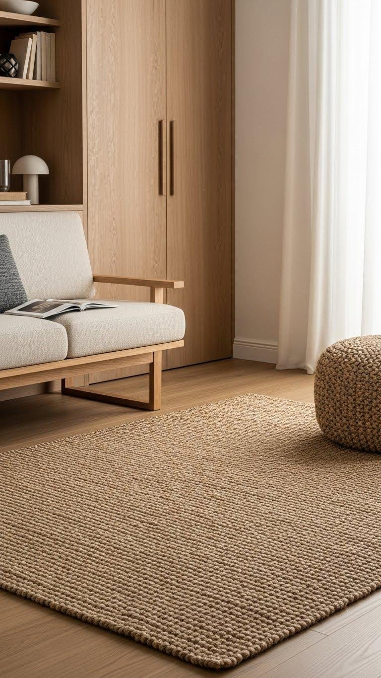 Choose rugs with jute textures or understated sisal patterns to define zones, add durable ease, and keep the aesthetic calm — letting you move freely without visual clutter.
