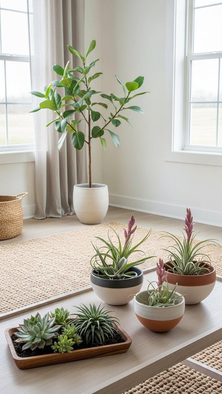 Choose sculptural plants that feel intentional: a lone ficus or a low-lying mini succulent cluster on a wood tray. Mix air plant arrangements in ceramic bowls for sculptural lightness.