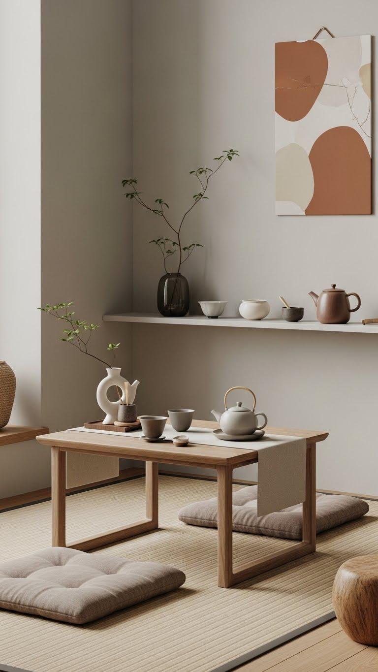 Carve out a quiet corner for tea with a simple low table, a single tatami or zabuton cushion, and a slim shelf to hold your teaware—keep shapes organic and colors muted so the setup reads calm at a glance.