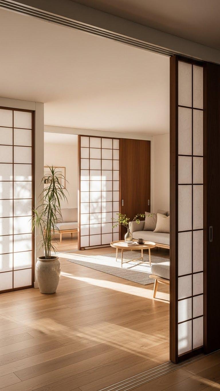 When you want privacy without blocking light, introduce shoji-inspired screens to gently define zones while keeping the room airy. You’ll love translucent paneling with rice paper textures that diffuse sun and soften sightlines.
