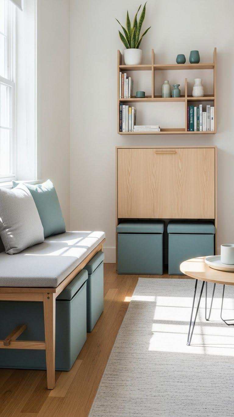 Choose pieces that do double duty so your space stays uncluttered and flexible. You’ll favor clean-lined benches, space saving ottomans with hidden storage, and convertible shelving that morphs between display and work surfaces.