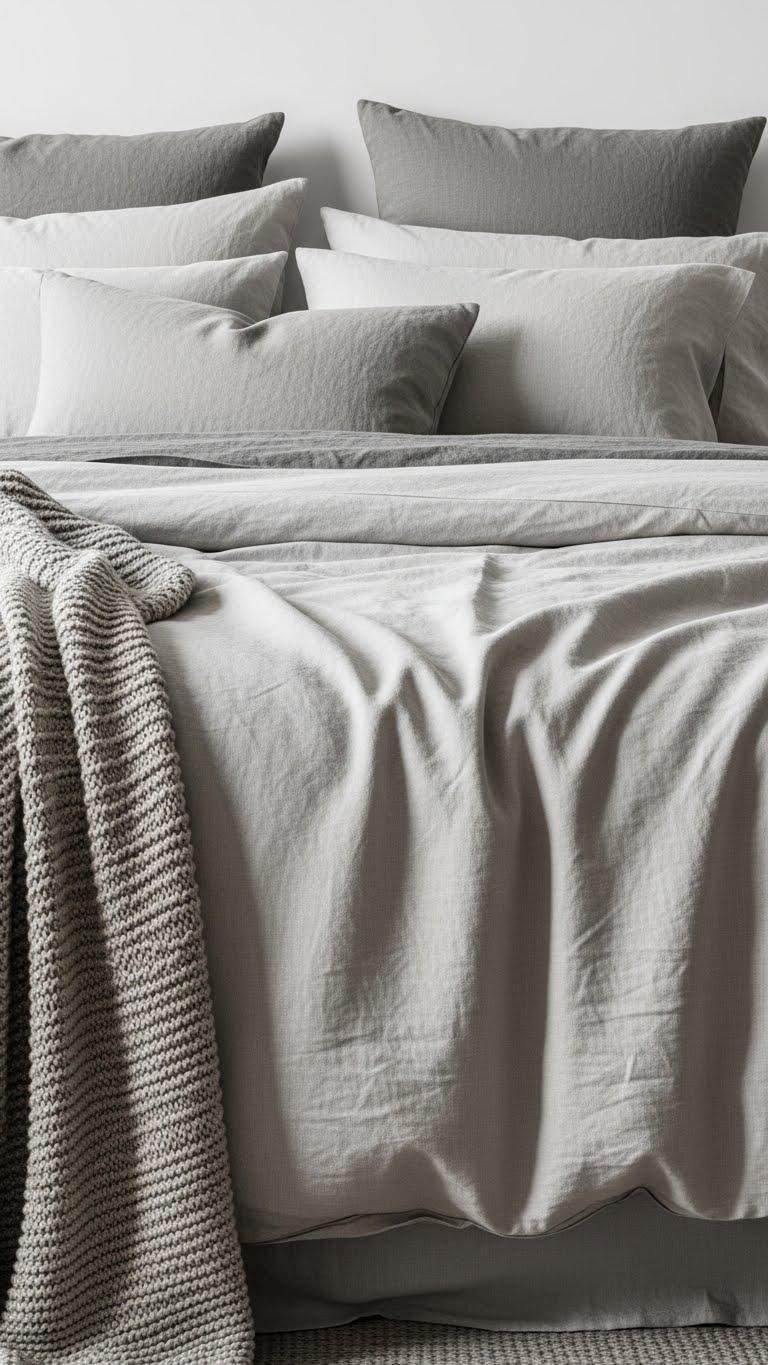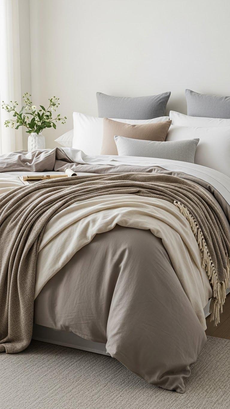 Start by building a base of crisp, neutral sheets and a mid-weight duvet, then add texture and depth with layered throws and pillows in varying shades of cream, taupe, and soft gray.