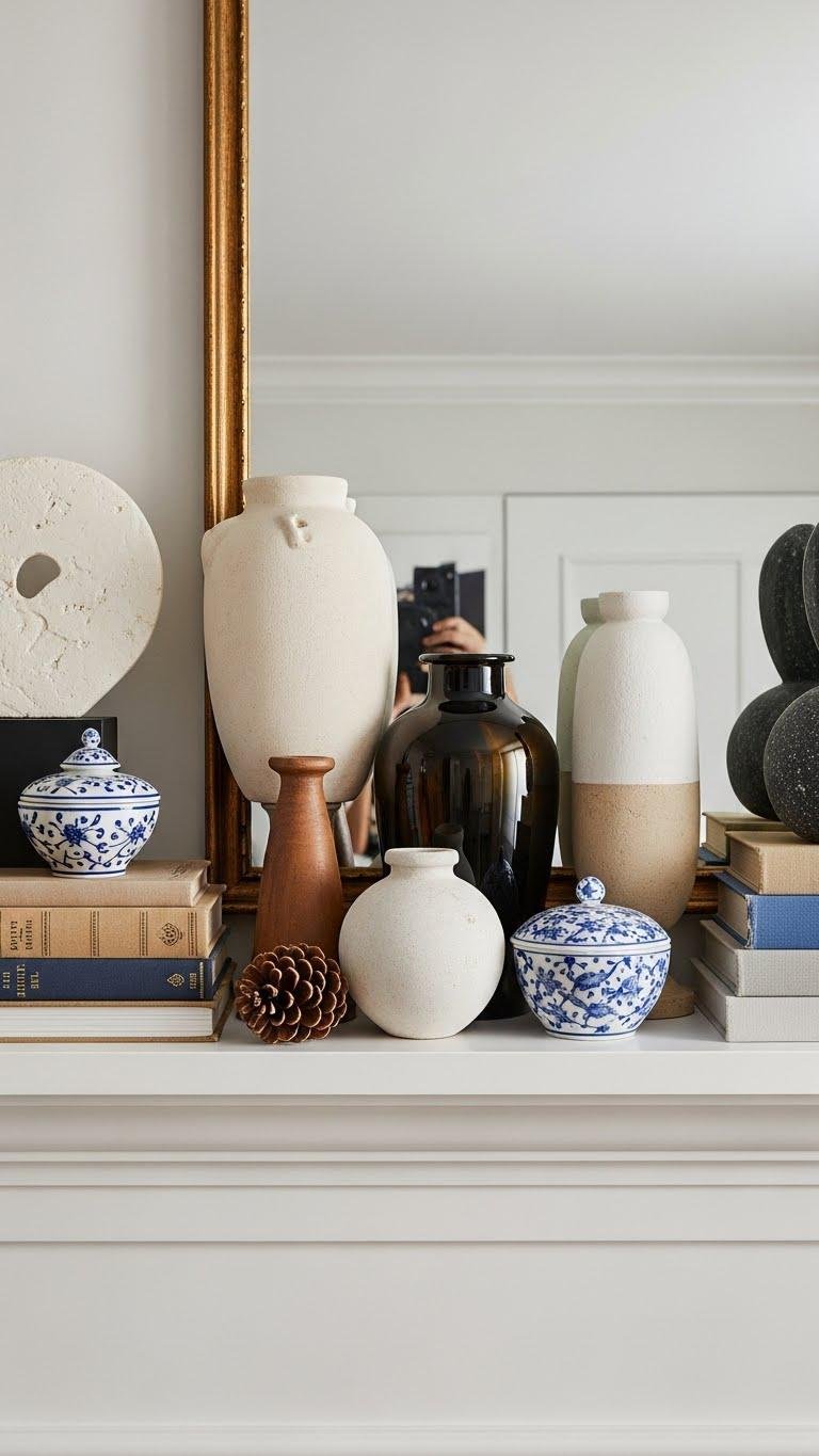 Let heirloom trinkets anchor authenticity, then add artful vessels, books, and sculptural forms.